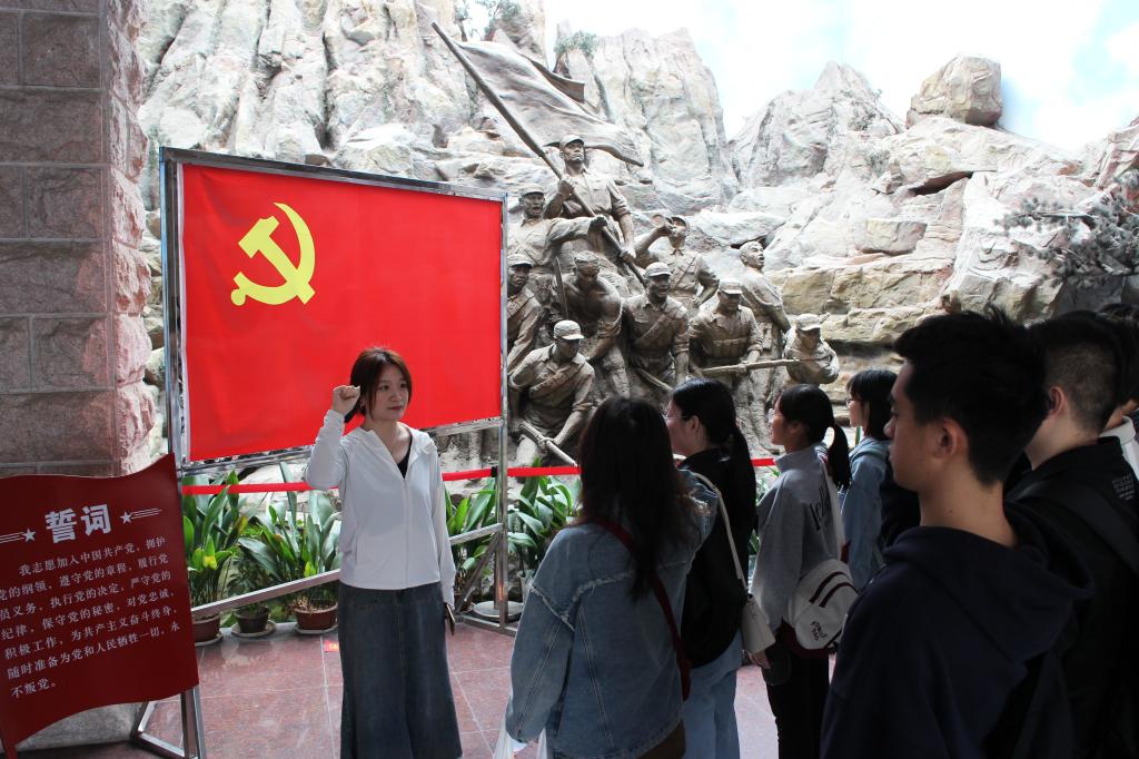 在茅山新四军纪念馆内,同学们依次参观了主馆陈列区、国防教育区、纪念瞻仰区和茅山爱国主义活动中心。馆内有珍贵文物90余件、馆藏文物、史料1万余件、书画作品60余幅,一件件一项项都令人震撼,展现了抗战时期军民奋起抵抗的英勇事迹。在纪念馆后院的烈士陵墓前,全体支部党员和入党积极分子怀着无比崇敬的心情肃立默哀,向为民族独立、国家富强、人民幸福献出宝贵生命的革命烈士寄托深切哀思。活动最后,支部党员在展馆中重温入党誓词,在新四军战士雕塑的注目下,研究生党员包雨轩带领大家面向党旗,庄严宣誓。鲜红的党旗擎起一颗颗赤诚的心,醒目的誓词凝聚起不忘初心的信念与力量。