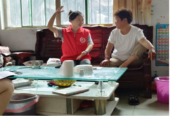 图为志愿者家访时与家长沟通