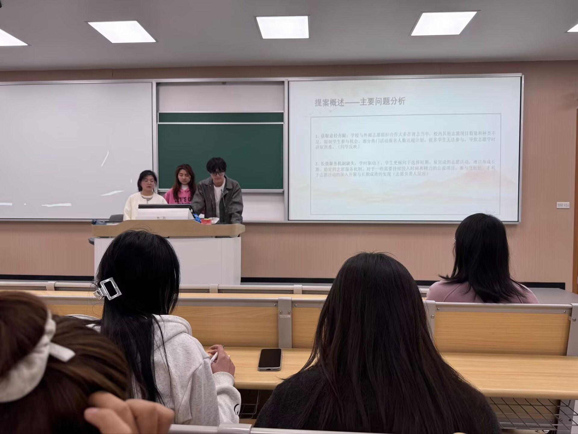 七支提案组分别就宿舍公共资源配备、志愿学时获取、后勤保洁人员休息场所设置、人际交往平台建设、考研知识普及与职业规划融合、学校水资源供应、AI代写论文现象分析等议题进行了展示,并针对相关问题提出了具体改进建议。评审团结合提案内容、实际情况与案据,进行了客观、全面的点评,既肯定了提案的亮点,也指出了不足,充分展现了其卓越的全局观与专业素养。
