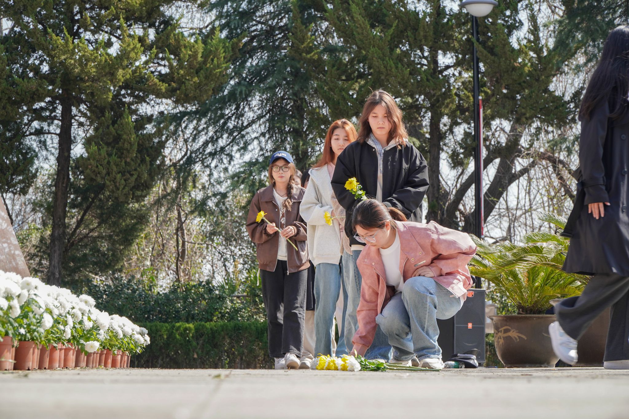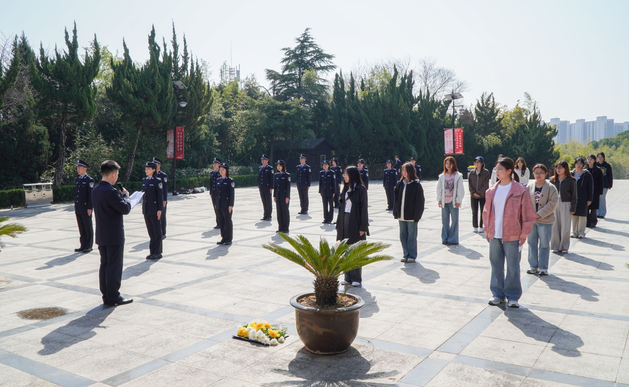 活动伊始,两校学生肃立于纪念场所,通过主题发言回顾先烈功绩,将计算机学科特色与爱国主义教育深度融合,以科技视角诠释新时代青年的使命担当。祭奠仪式上,全体人员手持菊花,默哀致敬,以简约庄重之礼告慰英灵。